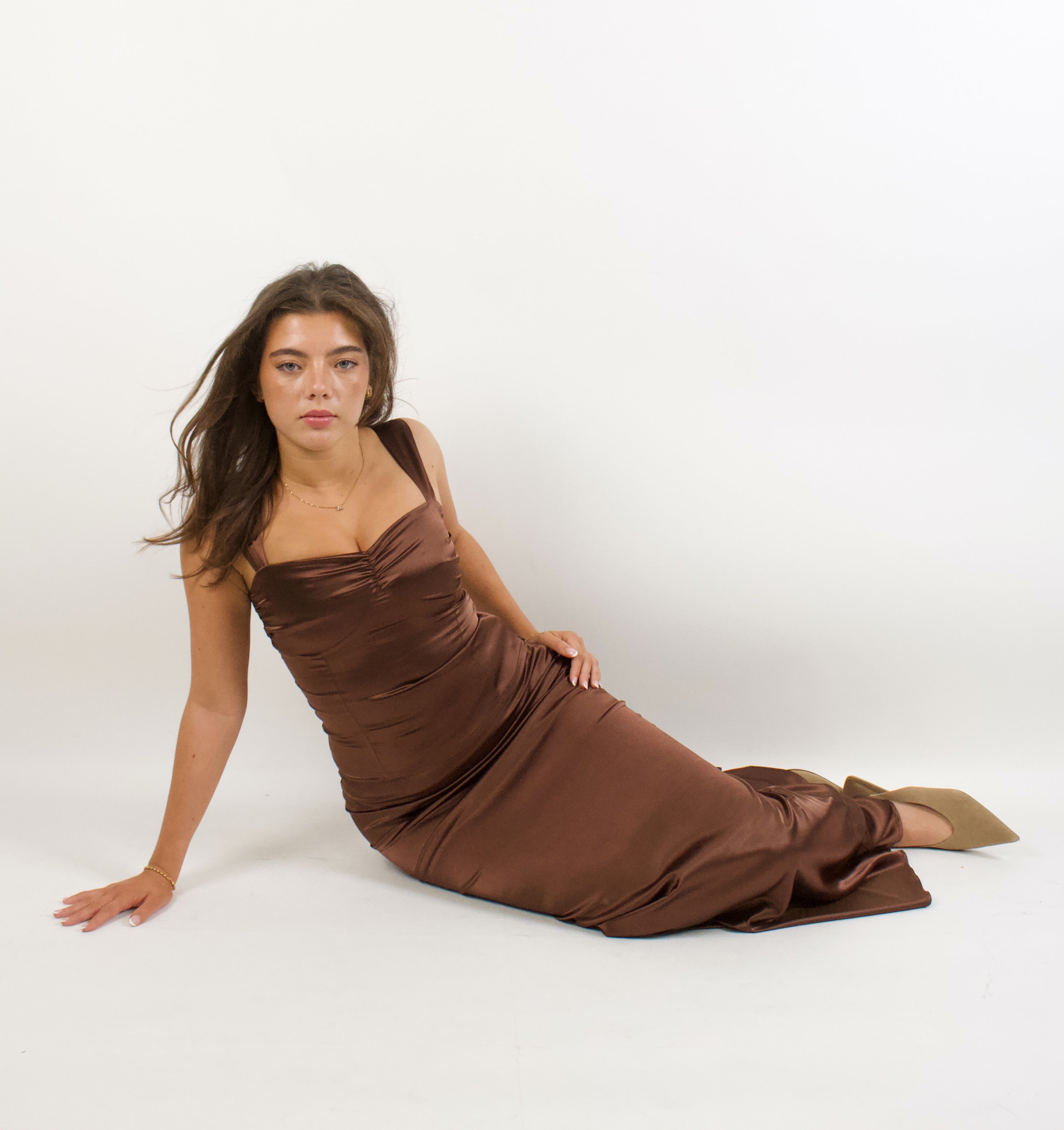 Fitted satin top in a gorgeous shade of brown, crafted with a lustrous, high-sheen surface that creates an elevated, couture-inspired look. The sculpted sweetheart neckline and refined front ruching enhance the silhouette, while wide straps provide a balanced, structured presence. Finished with a concealed side zip for a seamless, tailored fit. Designed to pair effortlessly with the matching satin skirt for a polished, luxurious set.