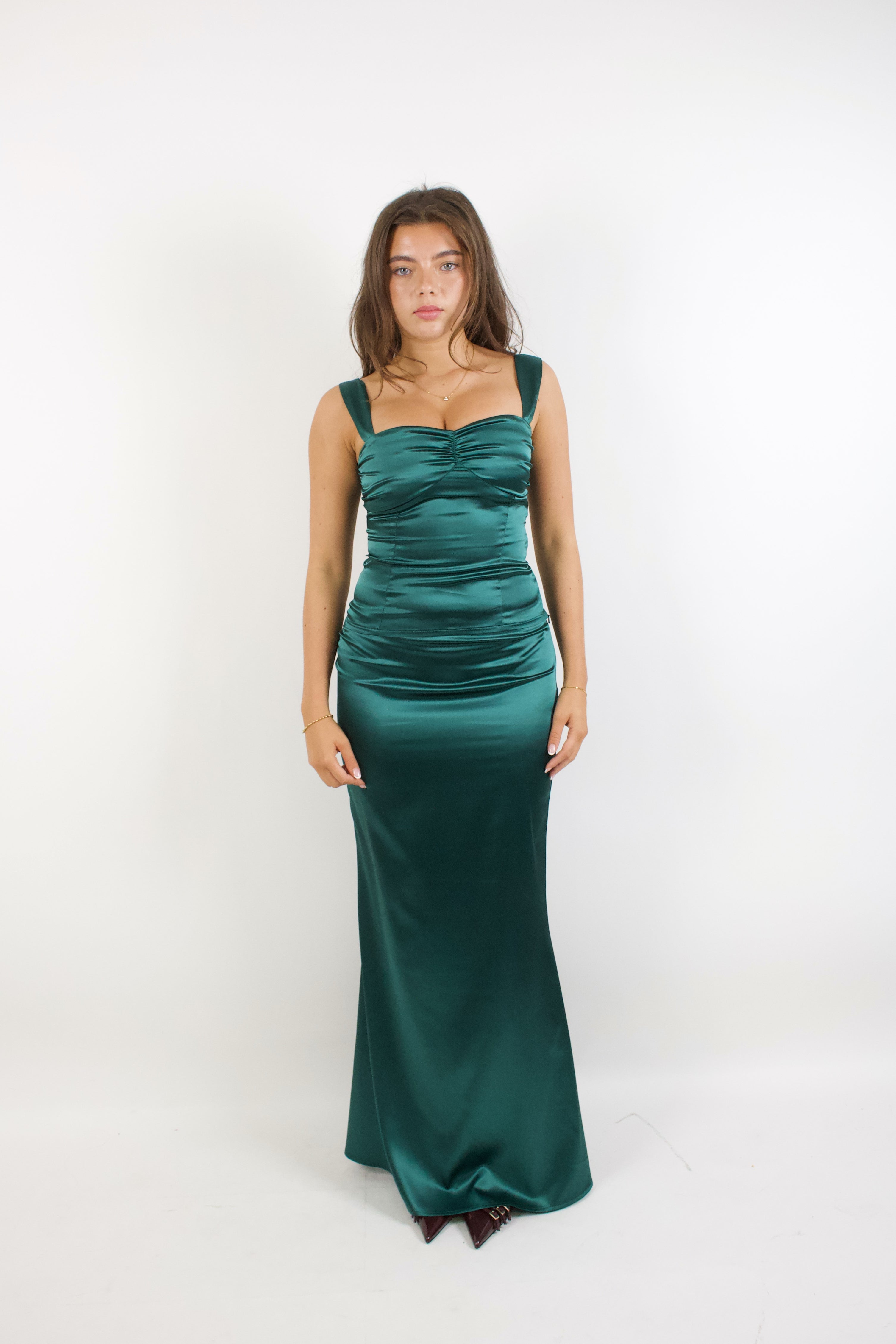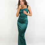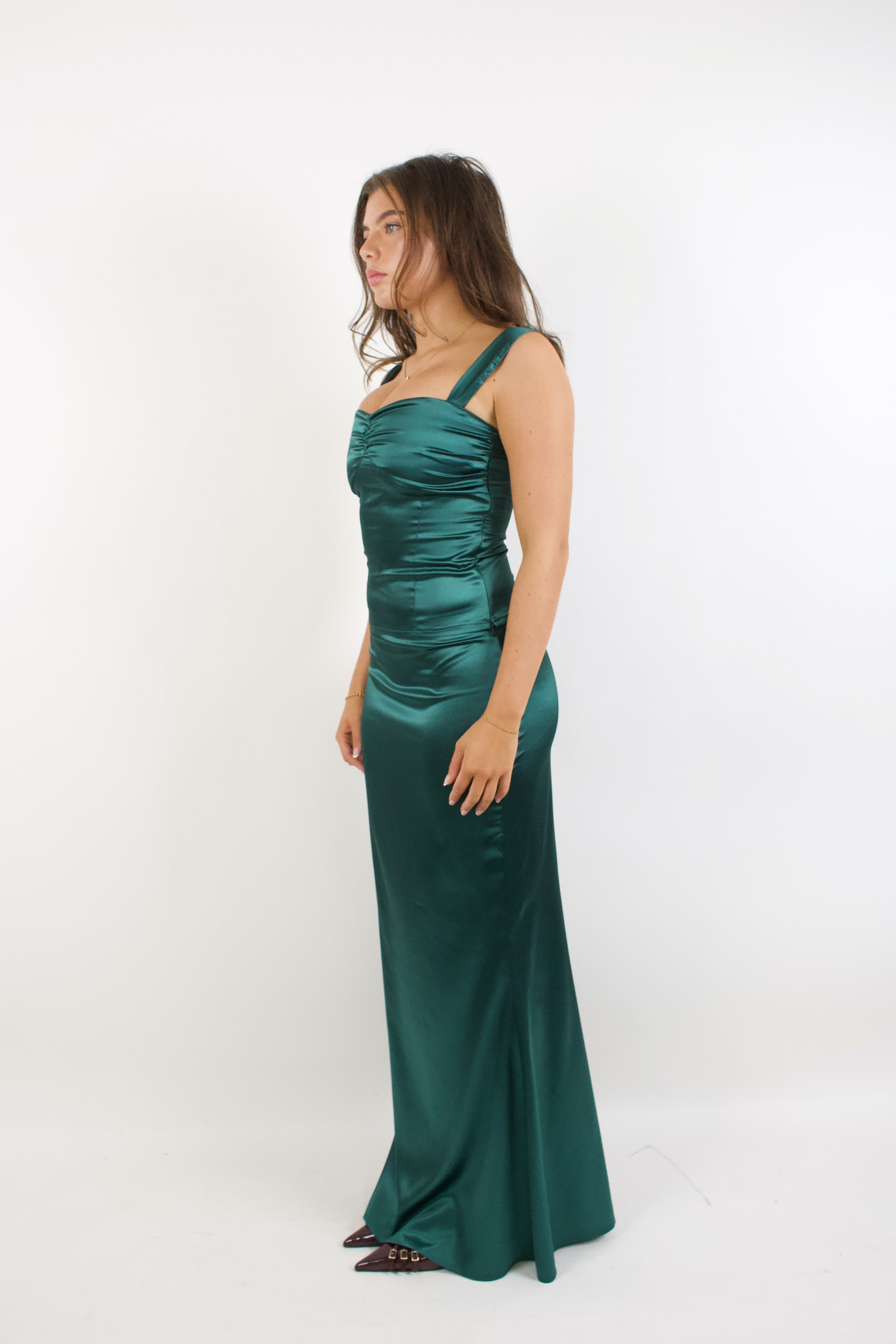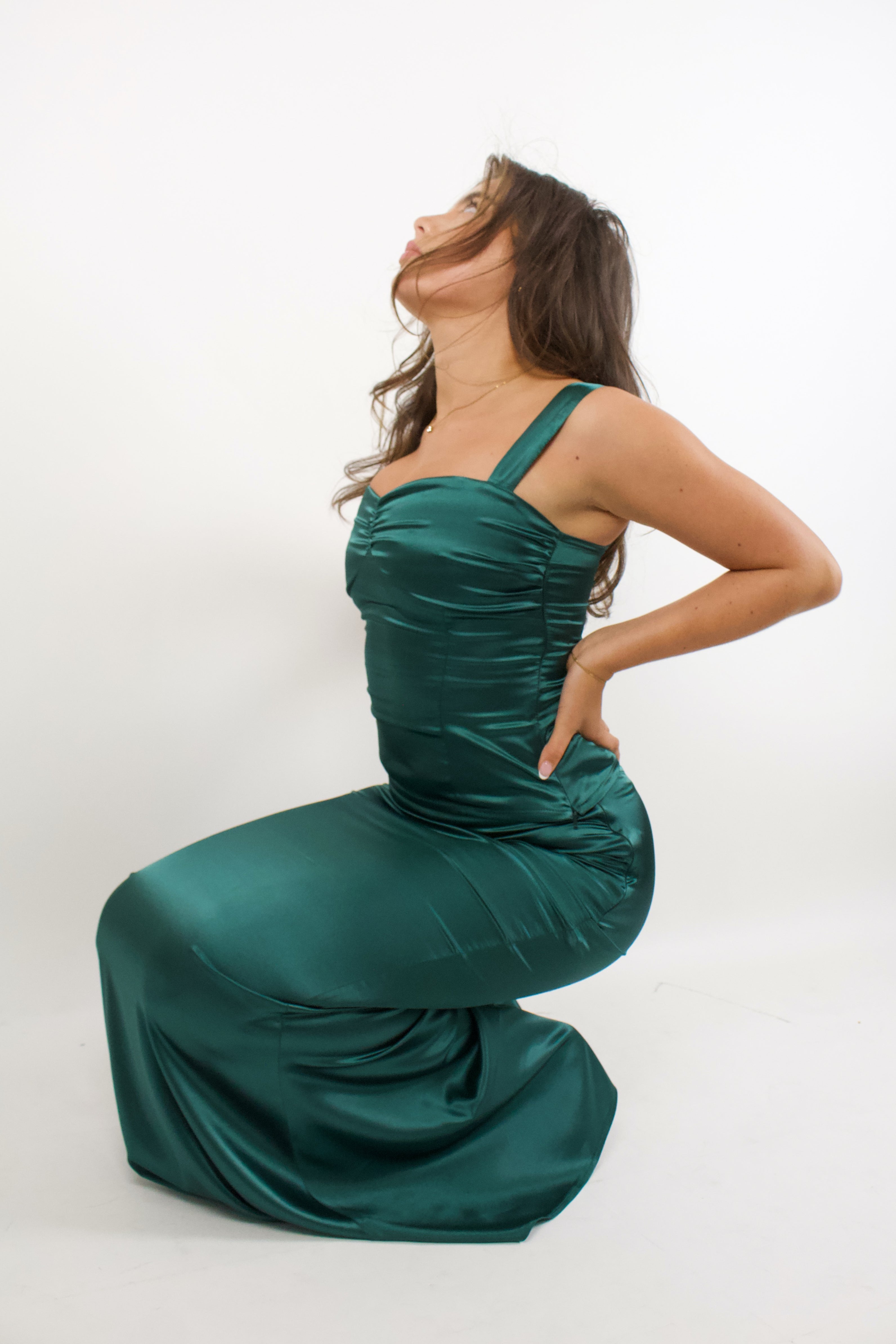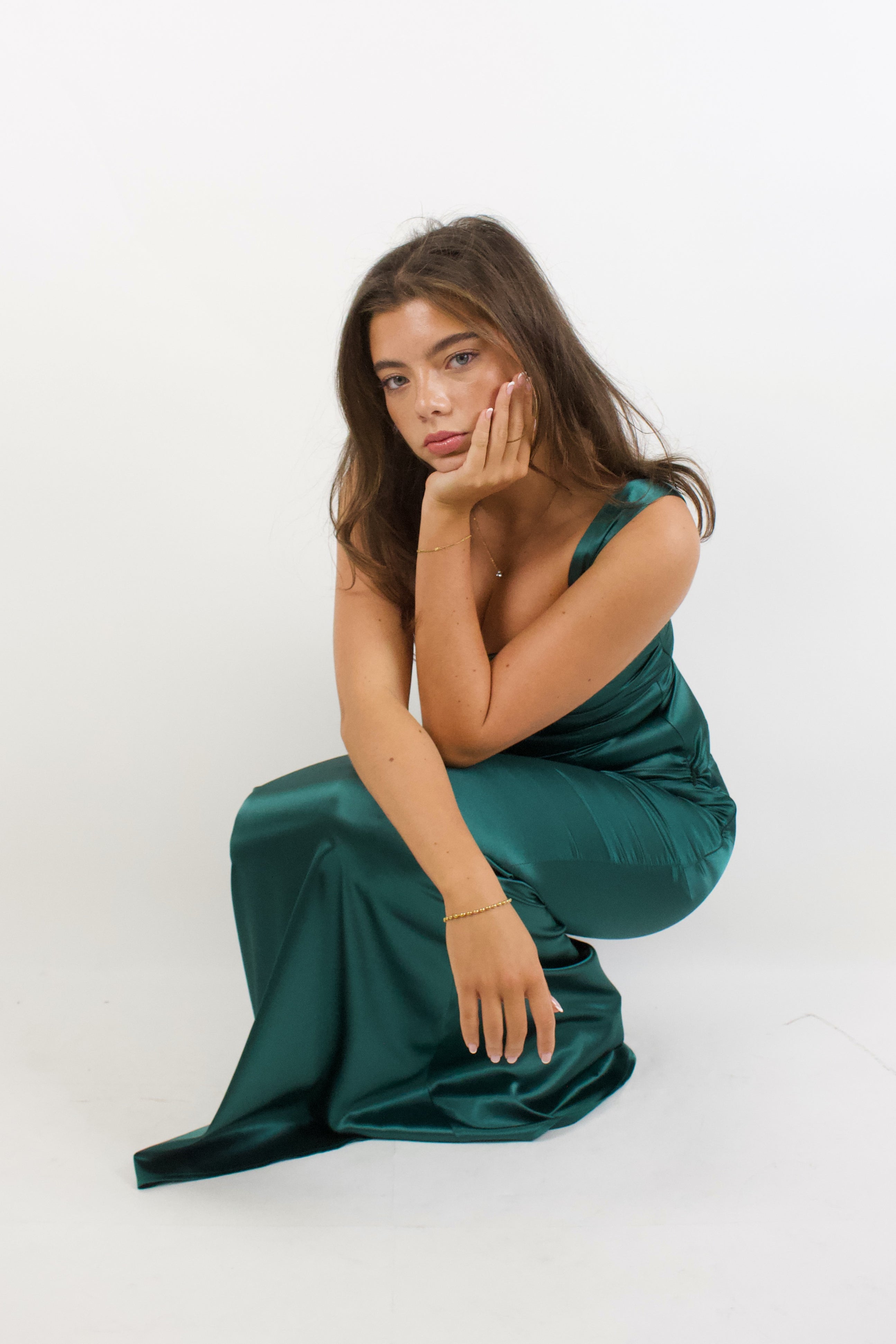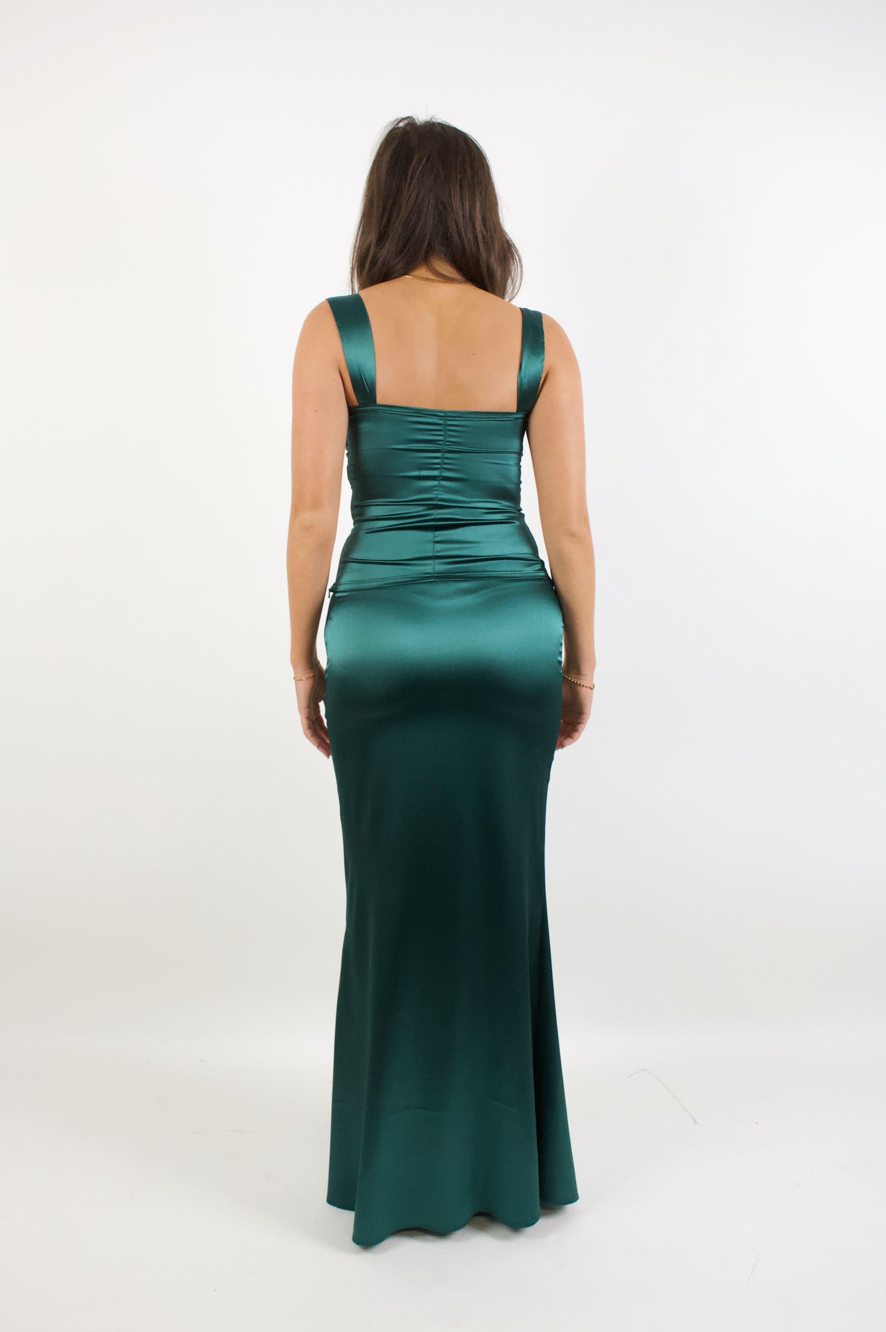 Timeless satin skirt in a bottle green colour, crafted with a lustrous, high-sheen surface that creates an elevated, couture-inspired look. Perfect for the events season. Finished with a concealed side zip for a seamless, tailored fit. Designed to pair effortlessly with the matching satin top for a polished, luxurious set.
